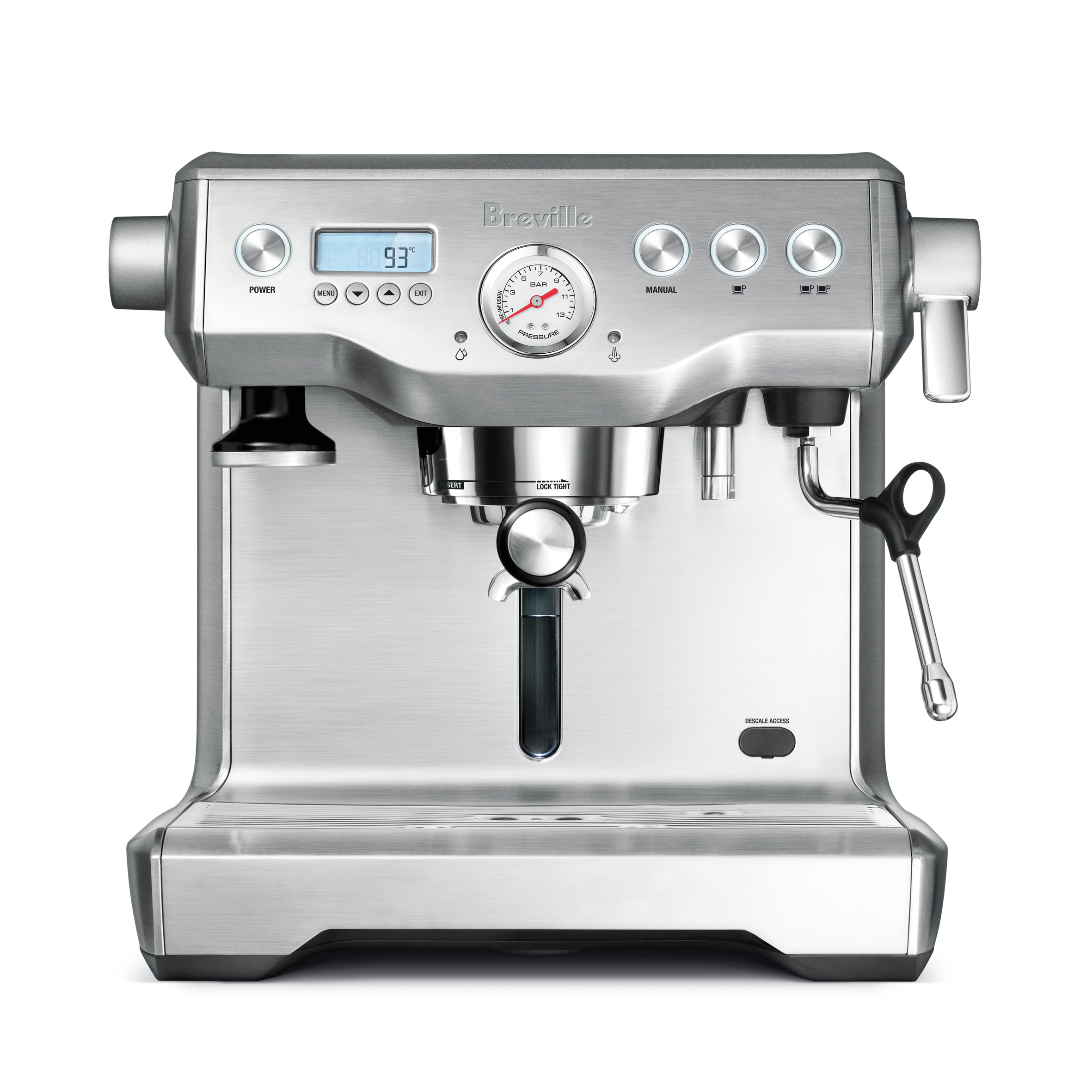 Full bodied coffee with rich and complex flavors is created using the ideal dose of 22g of freshly ground beans delivered by a professional style 58mm stainless steel portafilter.